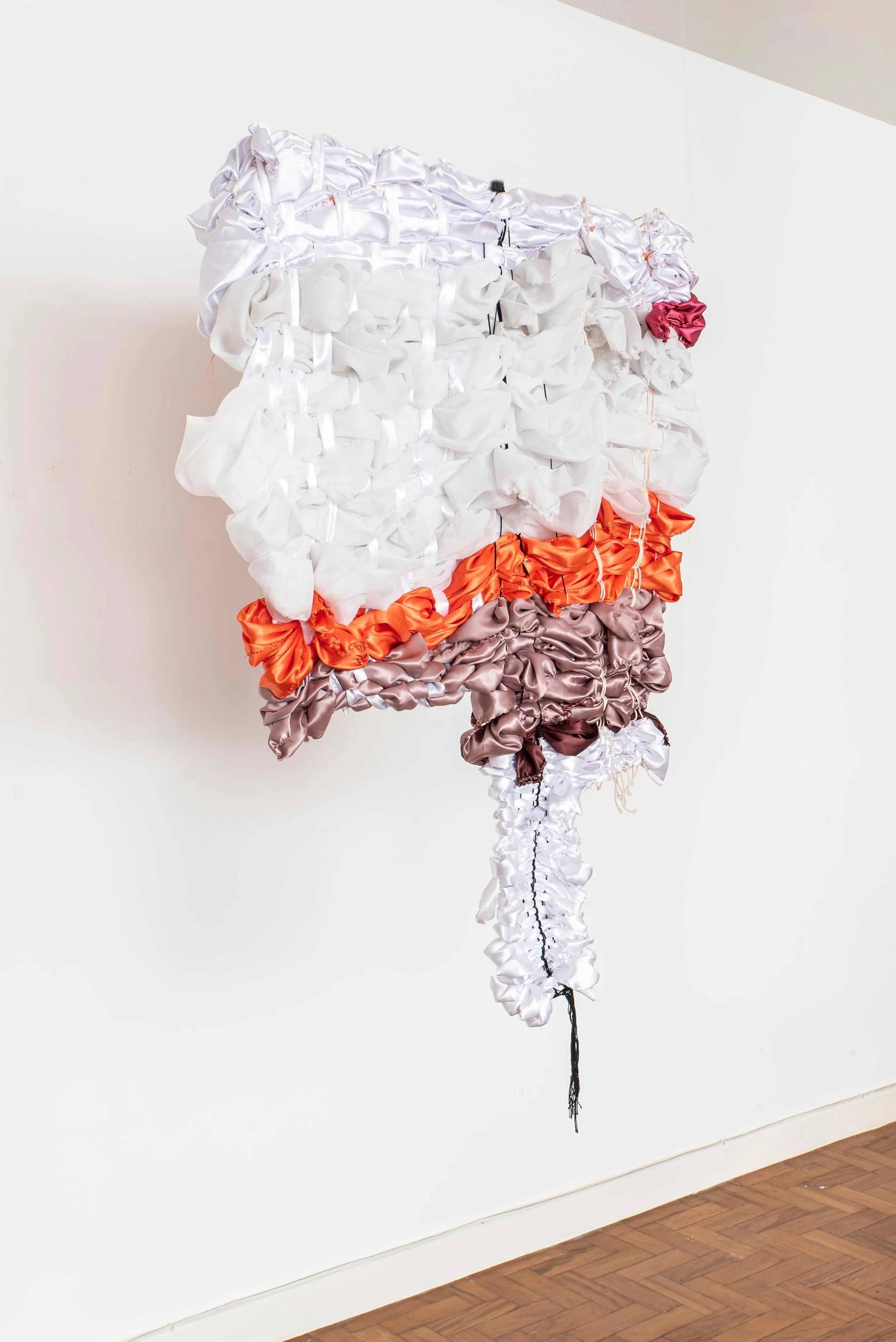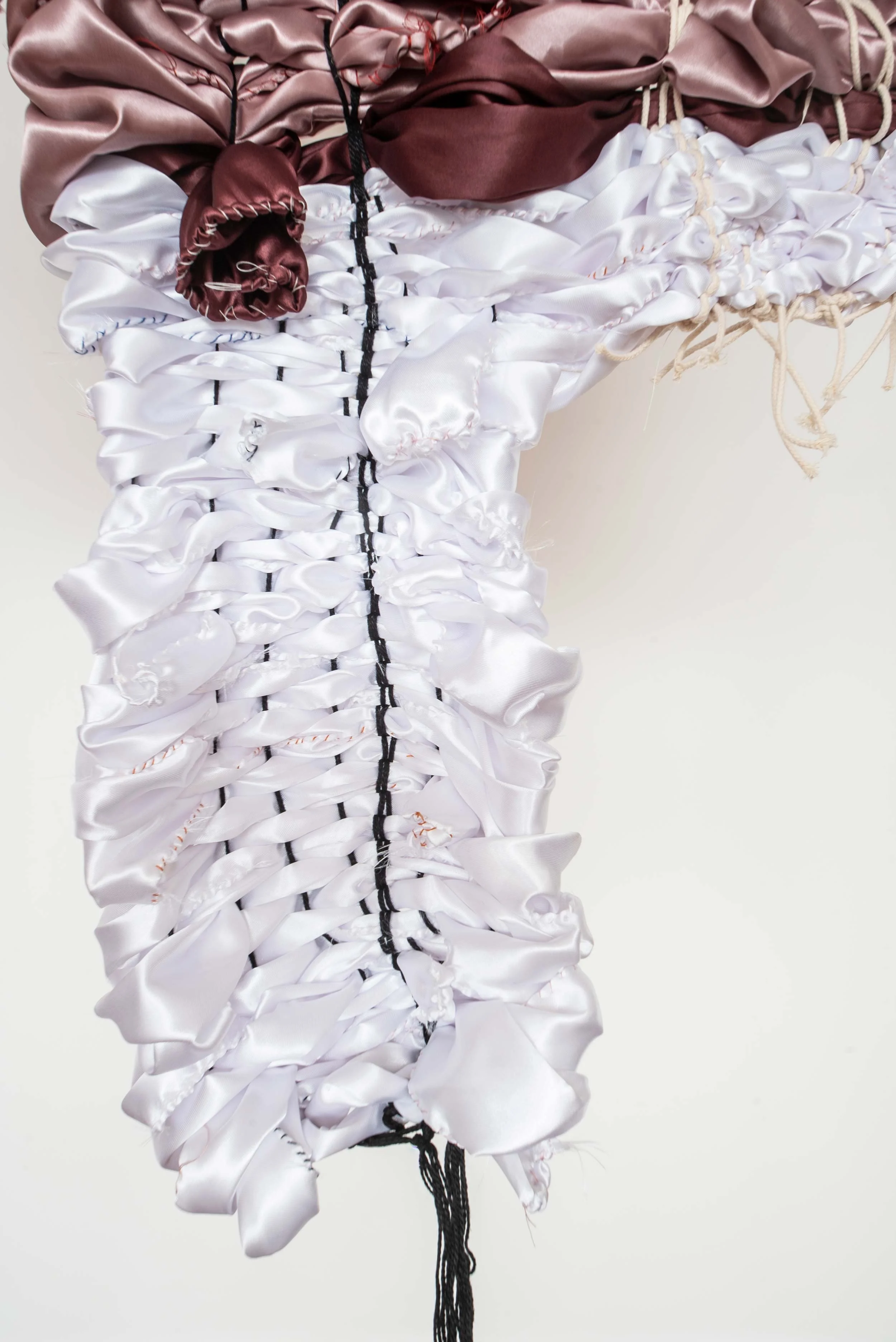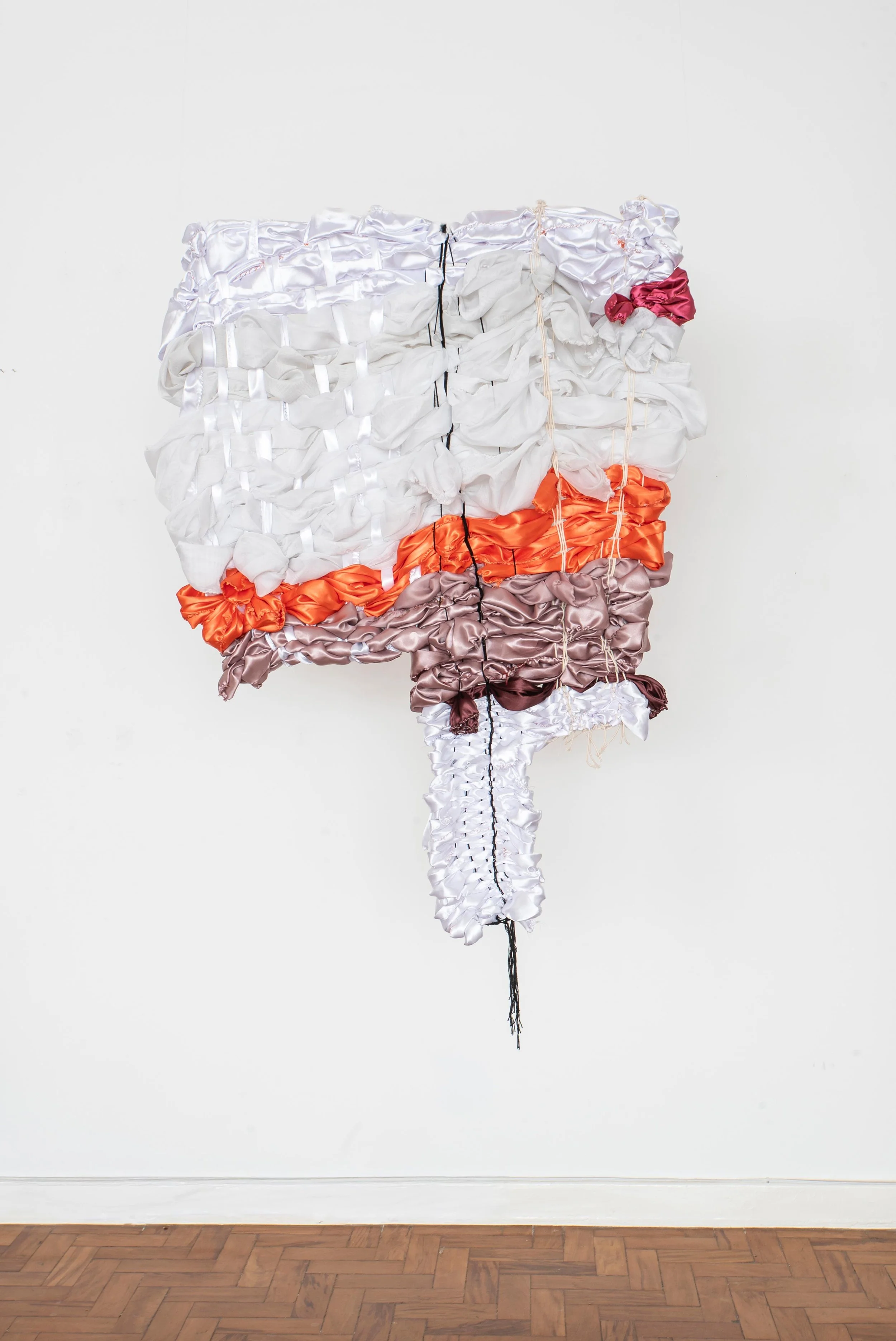 Fiteiro, 2026 . Urdumes em corda de algodão cru, fio de algodão e cetim com linha de costura, e tramas em cetim e voal com linhas costura, 140 x 84cm